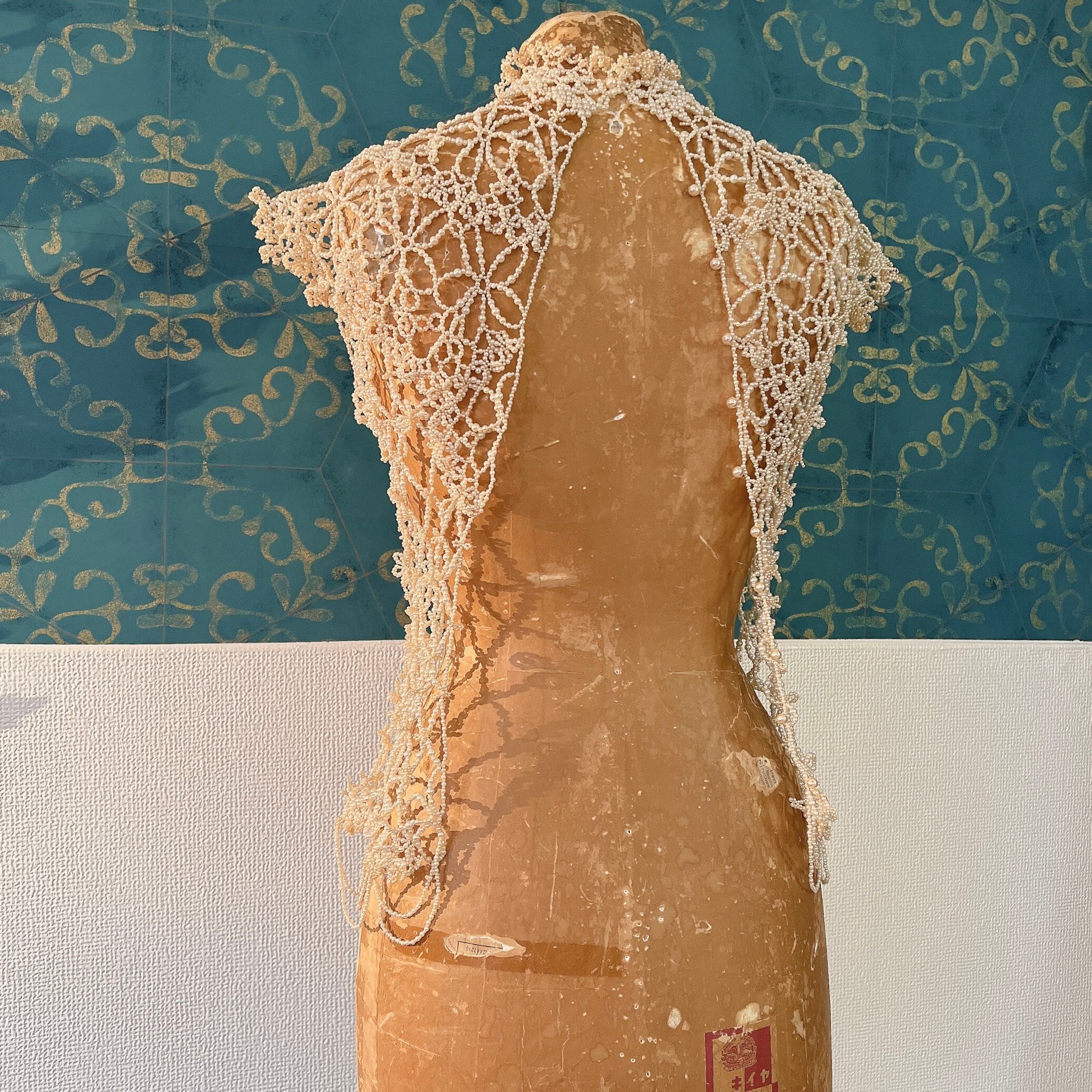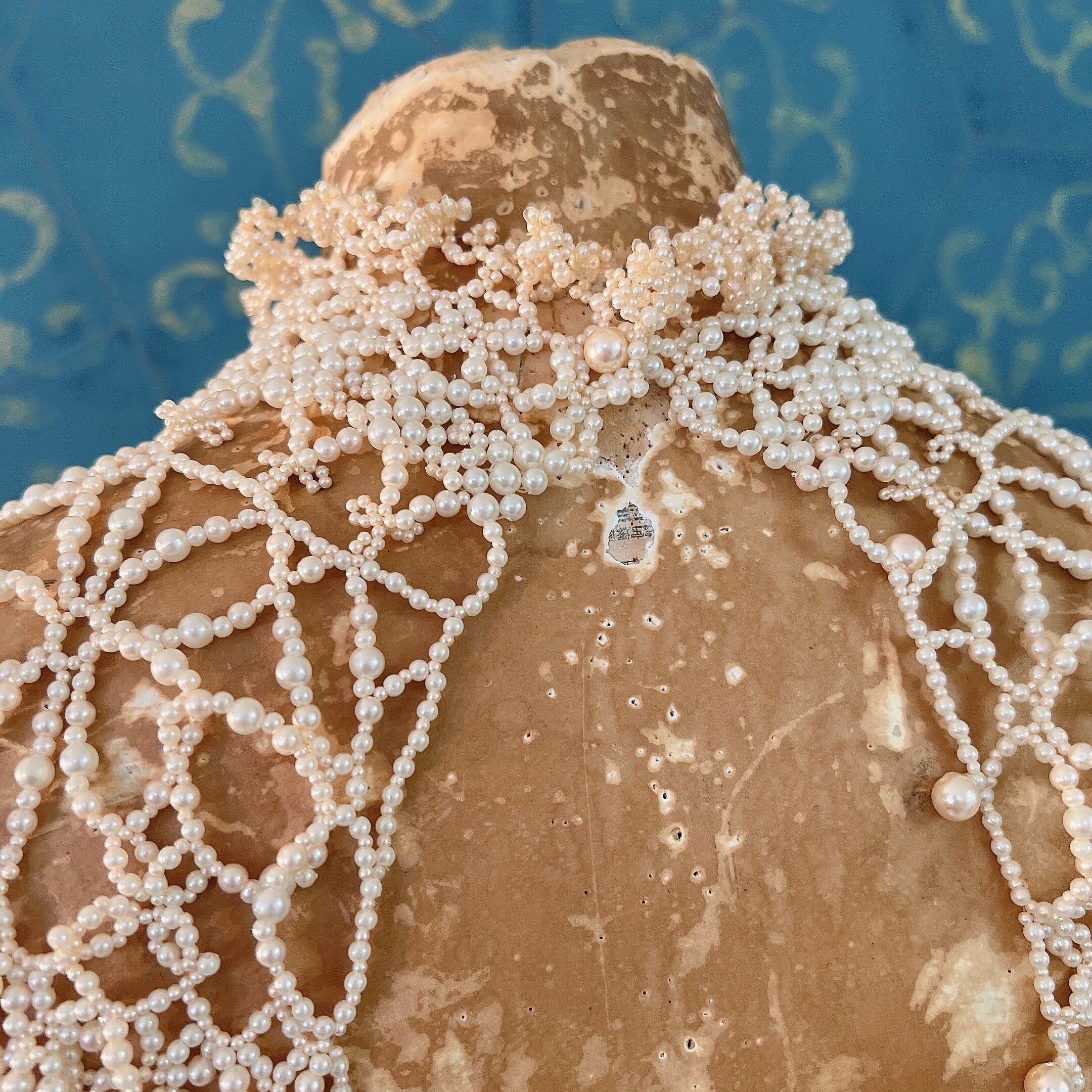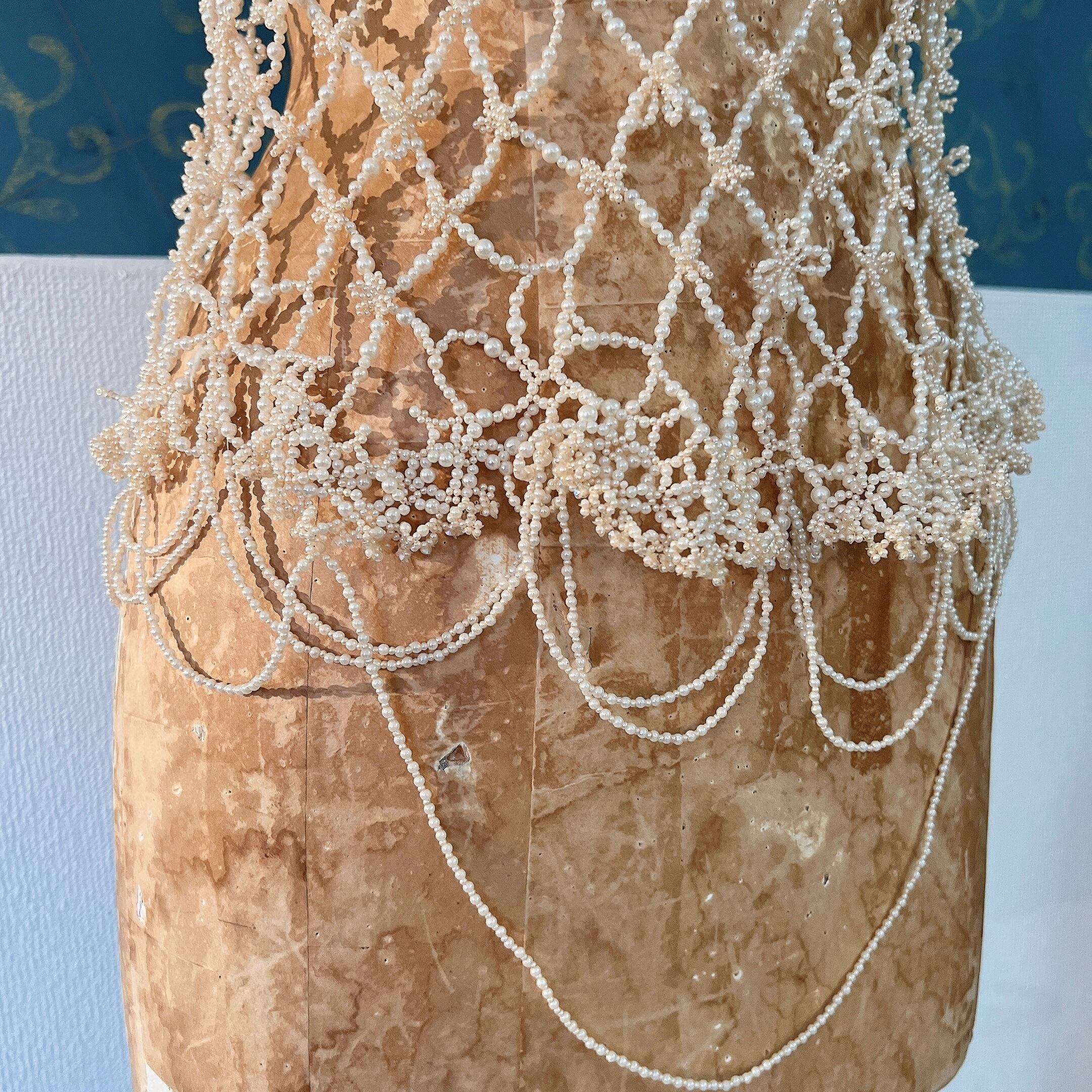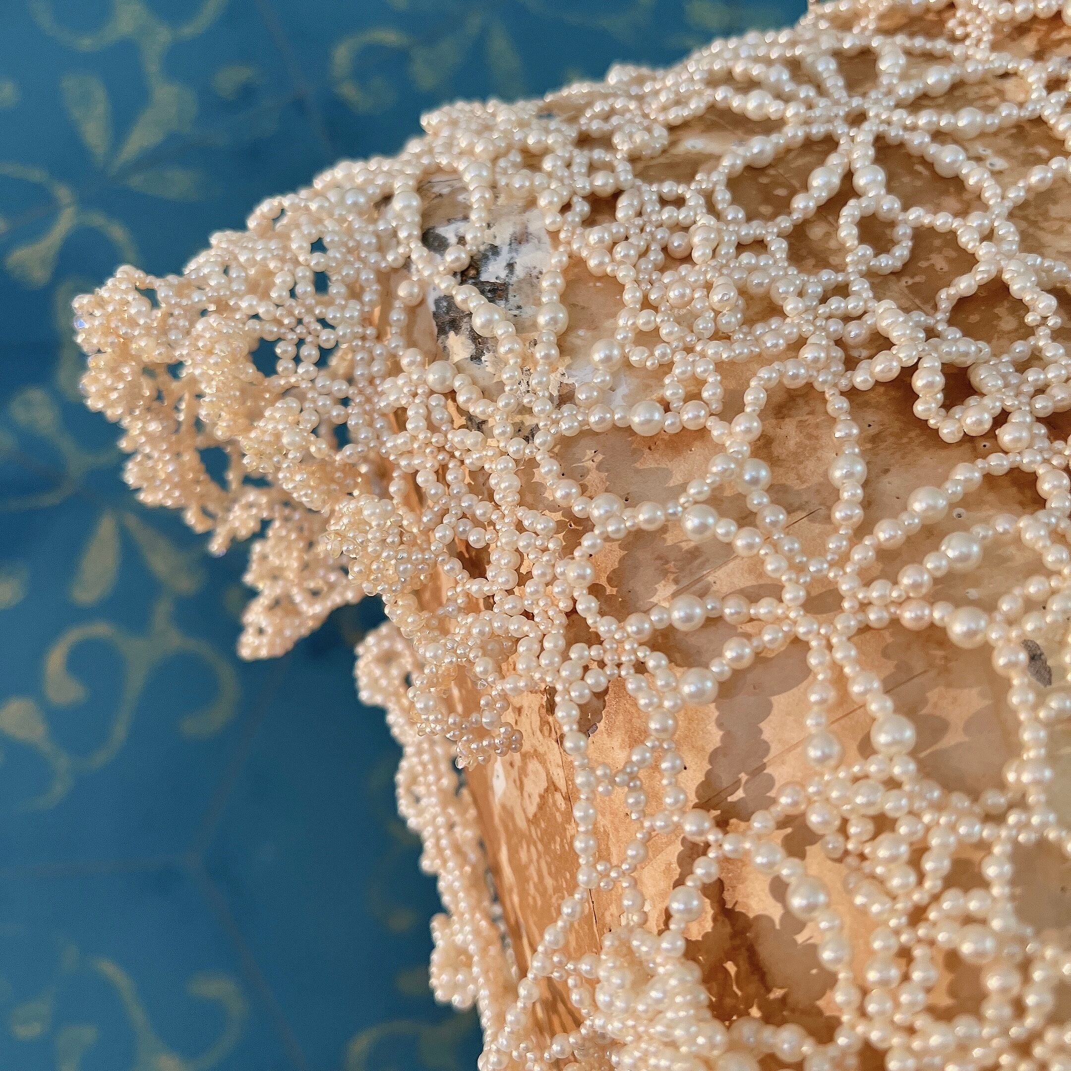 パールビーズを用いて繊細なレースのように編まれたビーズワークが素晴らしく、丁寧な手仕事に温かみと気品も感じられる逸品です