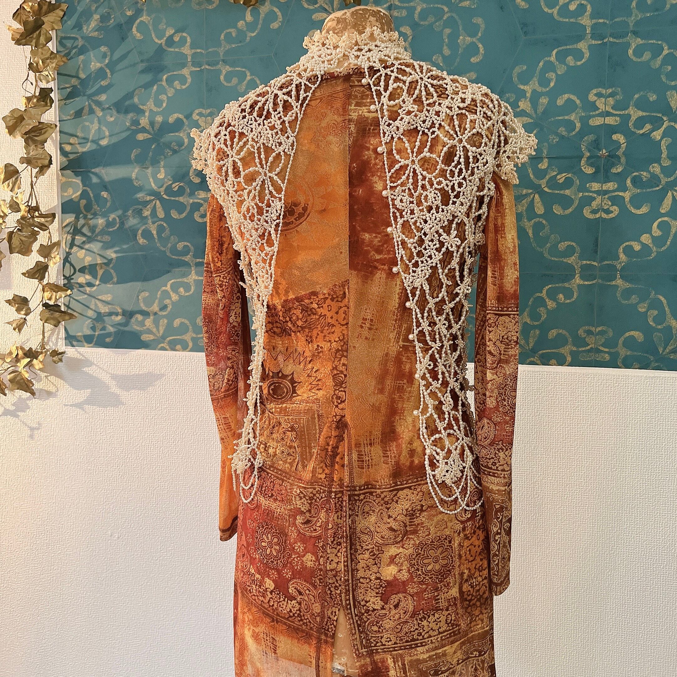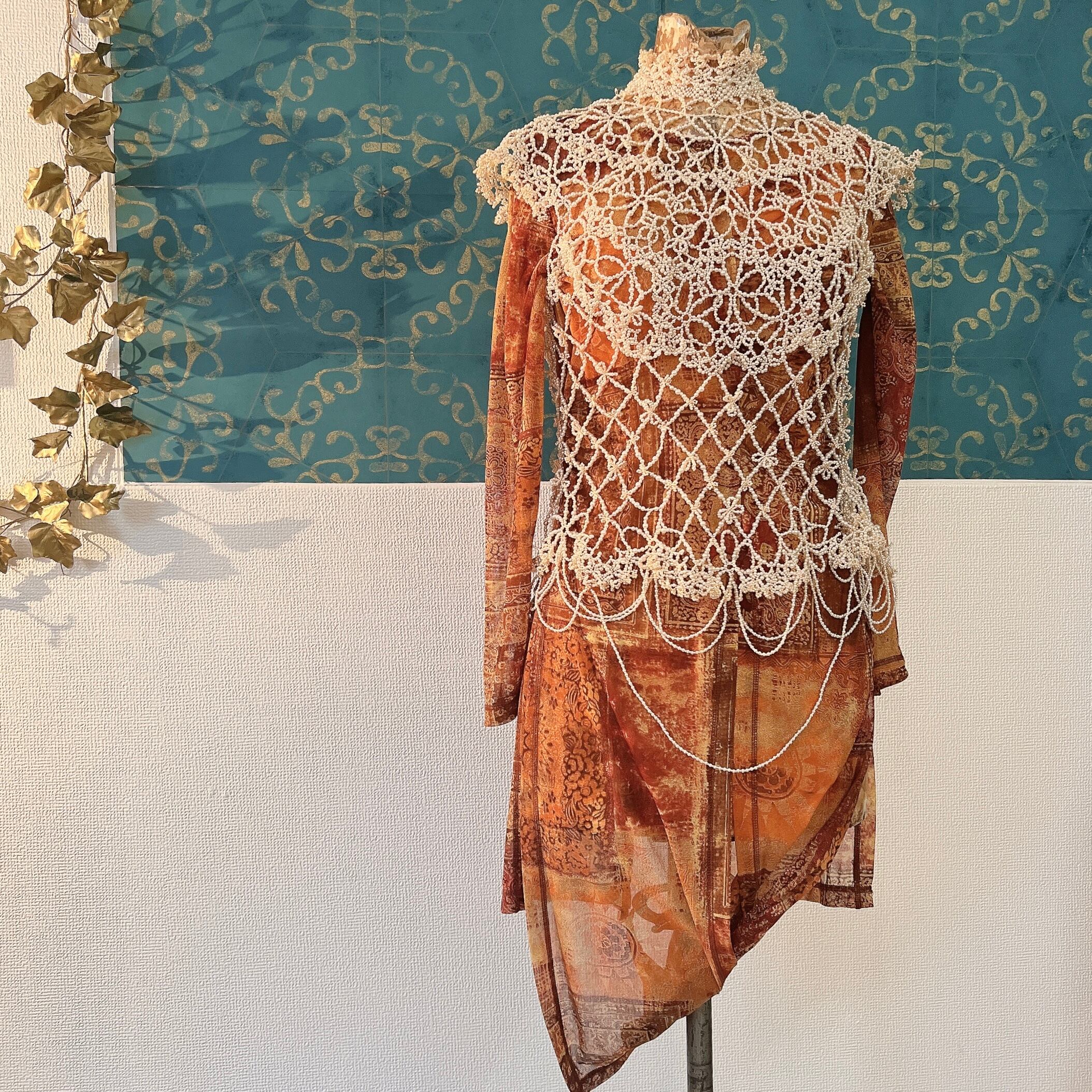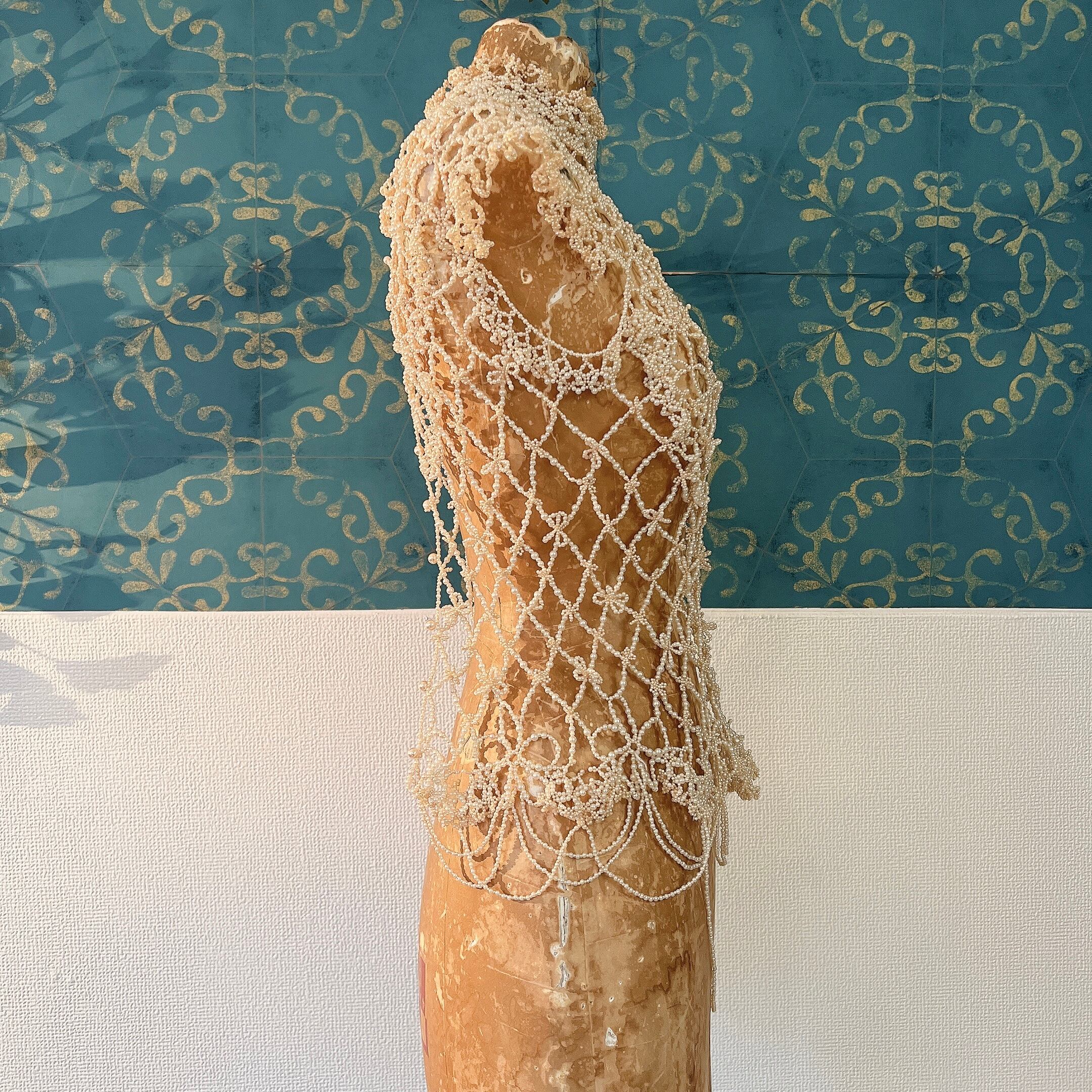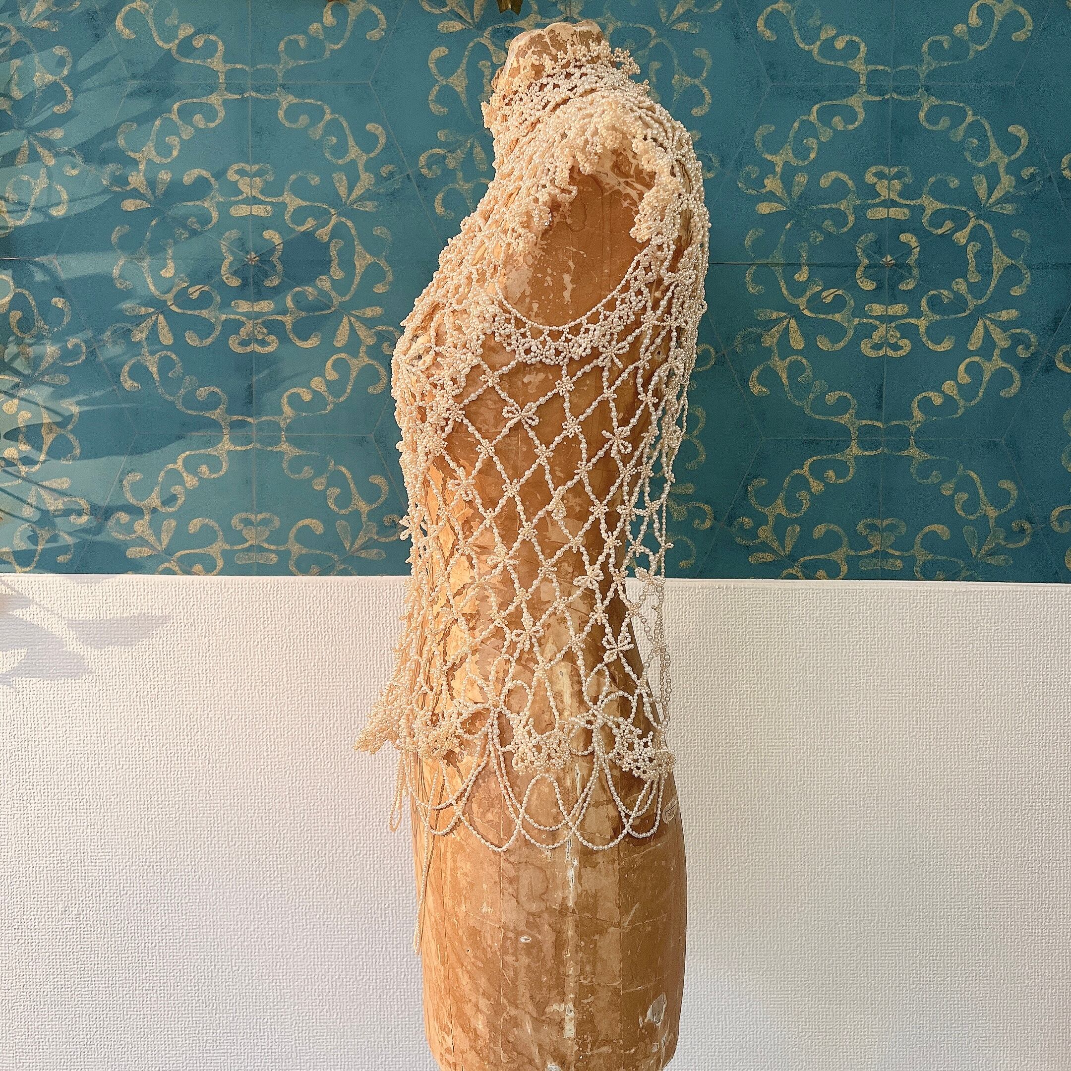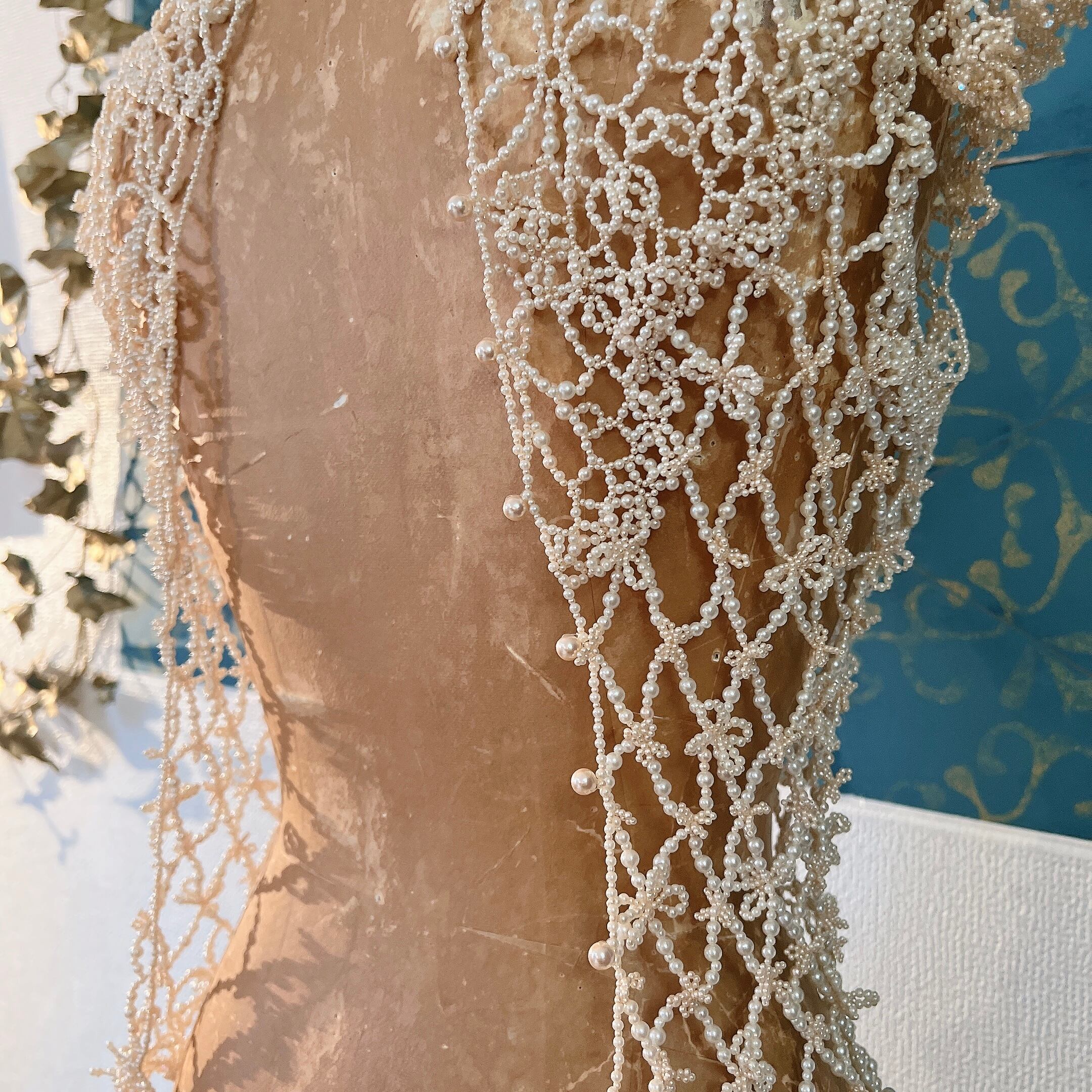 パールビーズを用いて繊細なレースのように編まれたビーズワークが素晴らしく、丁寧な手仕事に温かみと気品も感じられる逸品です